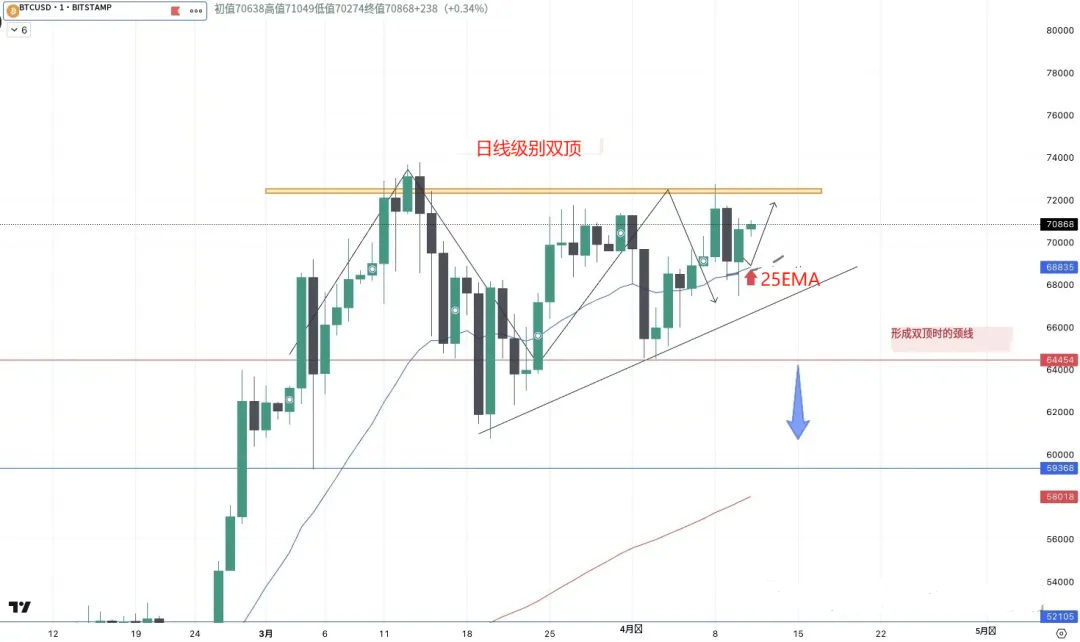 We can set the profit target at $71,000, and the highest could reach $73,000. If the market falls below the 25EMA moving average, I will update the strategy among the actual trading students.