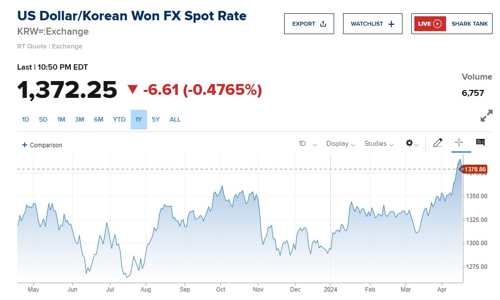 The South Korean won fell to its lowest level since November 2022 against the US dollar;