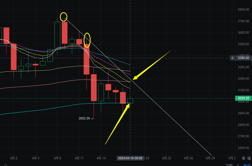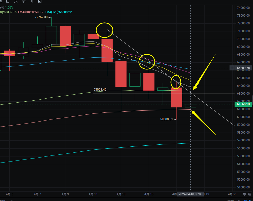 Bitcoin market analysis and operation suggestions for 4.18: The Bitcoin market fell more than expected yesterday, forming a false stabilization at EMA60 on the daily chart, and then a false high after the opening of the US stock market, breaking through EMA80 and the 60,000 mark, causing extreme panic in the market. Looking at the current market opening price, it continues to pull back above EMA80. We can carefully observe that the top of the daily coin price has formed a parallel downward trend. Therefore, we must be on guard against the possibility of yesterday's drama repeating itself. With less than 40 hours until Bitcoin's official halving, we need to consider whether the positive news has already been priced in before the announcement, leaving only false pullbacks and market crashes. This is also a common tactic of the main players, so we must be cautious! Therefore, we should focus on short positions as much as possible within these 40 hours, avoid going long, be cautious about being trapped, and prevent the recurrence of market crashes!