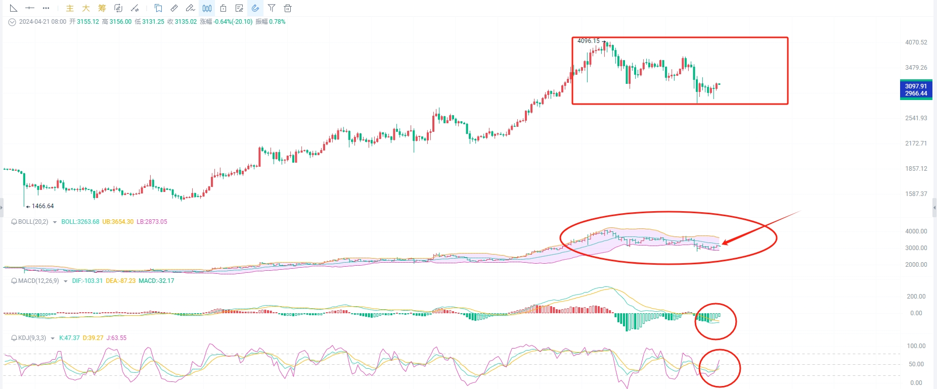 Yesterday's daily candle closed as a bullish candle, reaching a high of 3173. There is less than a hundred points of space to the resistance level above the trend line. Whether it can break through is not the main concern for now; let's focus on the market situation. Currently, the daily candle is at the EMA90 standing point of 3130, and after the KDJ formed a bullish crossover and started to diverge, the MACD showed decreasing volume and increasing funds for the fourth day, with the DIF and DEA getting closer and closer. After the Bollinger Bands opened up, the candle finally moved away from the lower band and approached the middle band at the resistance point of 3260. Be prepared to short if the upper range is not broken, and follow the trend to go long if it is broken. Set good stop-losses to avoid missing the opportunity for remedial action.
