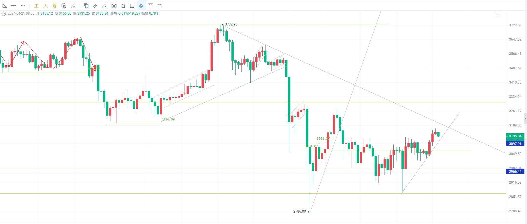 I hope everyone has a pleasant weekend. Today, on Sunday, the most concerning issue for everyone is whether the weekly chart will close with a bearish or bullish candle. So, how should the overall trend go? Where is the trend reversal point? How should we position ourselves? Don't rush, let's take it step by step. First, let's take a look at yesterday's market situation and the train of thought from yesterday's article. From yesterday morning, shorting above 3100 and closing the position at 3030 in the early morning, then going long and closing the position at 3110 in the late evening, a total of 150 points were gained from these two trades. After that, a short position was stopped out at 3140 after going long at 3110.