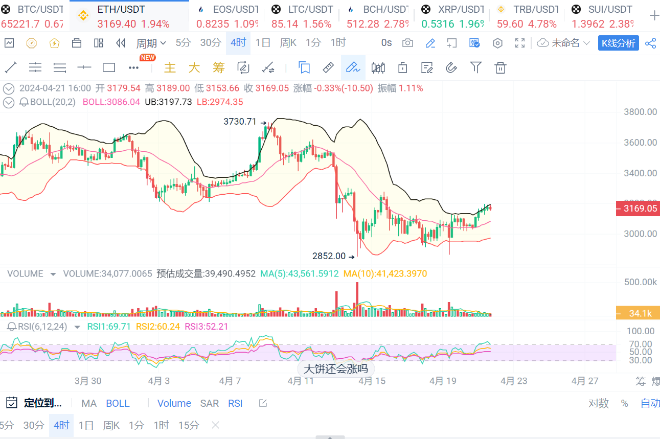 ETH: On the 4-hour chart, the price continues to oscillate near the upper track of the Bollinger Bands, with the support level at 3150 and the resistance level at 3190.