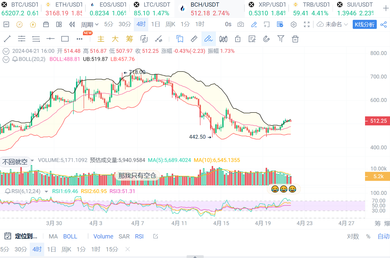 BCH: The price continues to stay above the middle track of the Bollinger Bands, with the market continuing to oscillate, and the support level at 500 and the resistance level at 530.