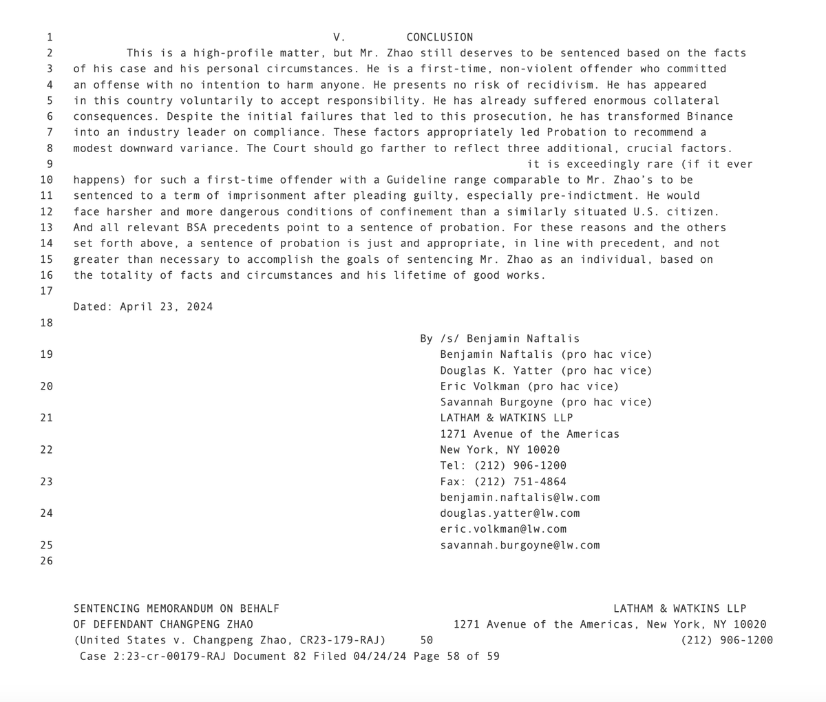 CZ's trial released the latest document, the sentencing memorandum from the law firm of Rui Sheng International. In this memorandum, it mainly elaborates on the causes and consequences of CZ's confession and cites a similar BSA case in which 26 defendants were not sentenced to imprisonment, arguing that CZ should not be the first, especially since he voluntarily came from a non-extradition country to the United States, resigned as CEO, paid a huge fine, and confessed voluntarily. These factors strongly support a lenient treatment, which would be more appropriate for probation.