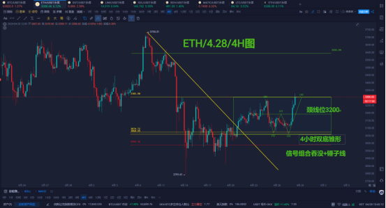 ETH Trend Analysis and Viewpoints: Ethereum's trend this week saw consolidation in the first half of the week and a rebound after a decline in the second half of the week; yesterday, Ethereum relied on the price near 3050 to stop the decline and launch a counterattack. After forming a small double bottom probing pattern, the bulls finally exerted force, producing a moderately strong bullish candle, breaking through 3200 and reaching around 3300. Signs of the end of the oscillating downward adjustment that has lasted for a month and a half and the continuation of the bullish trend line are expected; a new uptrend line on the daily chart has been established; the target after stabilizing at 3300 is 3450-3500, followed by the 3700 area; the price structure on the 4-hour chart from the 25th to the 27th formed a double bottom, establishing the first resistance neckline at 3200, which was strongly broken through to reach 3300, while 3050-3300 formed a box oscillation. If calculated as a one-fold range, then the short-term target for the bulls points to 3500-3550; short-term operations are advised to focus on the bulls and avoid the bears!