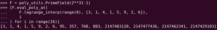 Some Reed-Solomon extensions of polynomial evaluations. Despite the original values being small, the additional values are extended to the full size of the field (in this case, 2^31 - 1)