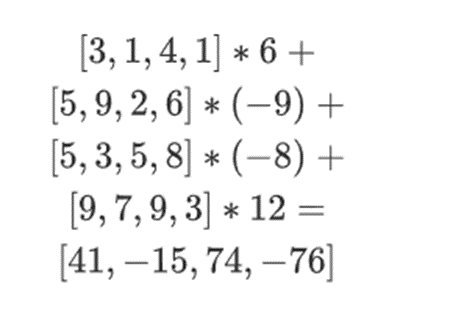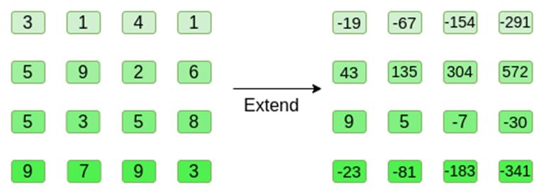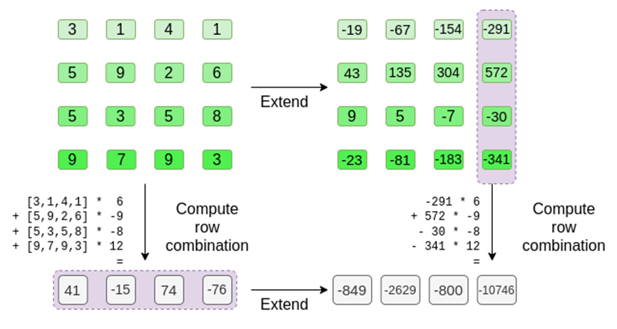 Note that the numbers quickly expand! This is why in the actual implementation, we always use finite fields instead of regular integers: if we use integers modulo 11, for example, the extension of the first row would be [3,10,0,6].