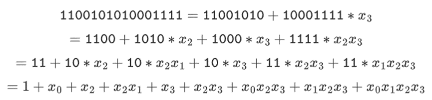 This is a relatively uncommon representation, but I like to represent binary field elements as integers, with the more efficient bits on the right. That is, 1=1, x0=01=2, 1+x0=11=3, 1+x0+x2=11001000=19, and so on. In this expression, it is 61779.
