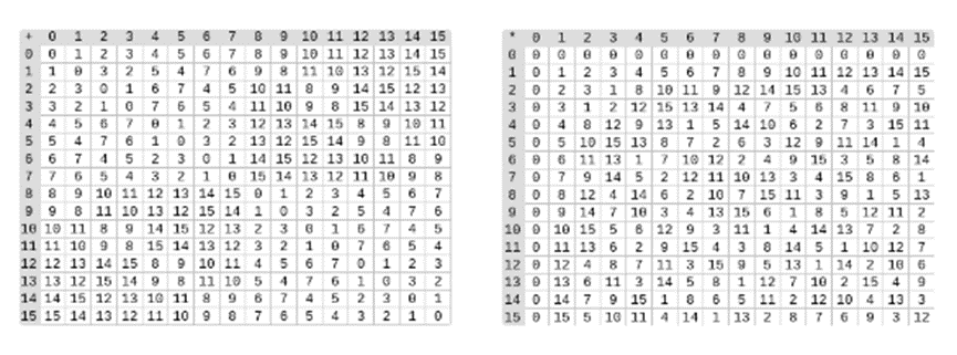 Left image: Addition table for four-bit binary field elements (i.e., consisting only of 1, x0, x1, x0x1). Right image: Multiplication table for four-bit binary field elements.