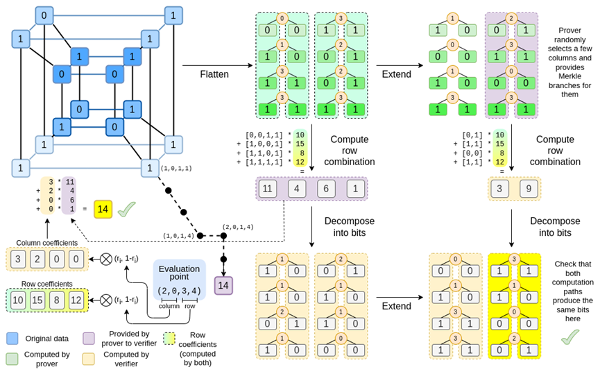 In Binius, we are committed to a multilinear polynomial: a hypercube P(x0,x1,…xk), where individual evaluations P(0,0,0,0) through P(1,1,1,1) store the data we care about. To prove a computation at a certain point, we reinterpret the same data as a square. Then, we extend each row using Reed-Solomon encoding to provide the necessary data redundancy for secure Merkle branch queries. We then compute random linear combinations of the rows, designing coefficients such that the new combined rows actually contain the computed values we care about. These newly created rows (reinterpreted as 128 rows of bits) and some randomly selected columns with Merkle branches are passed to the verifier.
