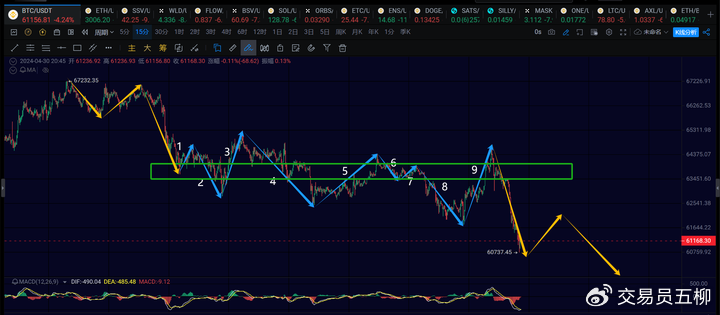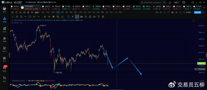 Bitcoin has effectively fallen below 62,000 here, so it is highly likely to retest 59,000 as expected. Moreover, looking at the structure of Ethereum, after the rebound on the 4-hour level to 3300, it failed to accelerate the rise and fell again. In yesterday's article, we mentioned that Ethereum had a 15-minute rebound to 3200, and then there would be a third 15-minute pullback to the 3000-3050 range, which has now been reached and even pierced through 3000. Judging from the intensity of Ethereum's pullback, it is likely to undergo a new 4-hour level pullback and retest around 2800. Therefore, judging by the synchronicity of Bitcoin and Ethereum, Bitcoin should also retest around 59,000.