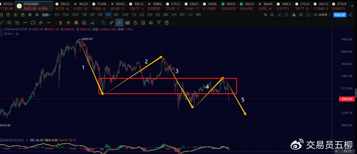 The 4-hour level structure of Ethereum is currently much clearer than that of Bitcoin. It has already completed four 4-hour structures and consolidated a 4-hour central pivot in the 3056-3350 range. It is currently undergoing the fifth 4-hour level decline, with the target of this decline expected to be around 2800-2750. After the completion of the fifth 4-hour level decline, the market is likely to usher in a new round of rise, which is expected to quickly form a rapid V-shaped rebound, not lingering too long to provide an opportunity for bottom fishing. Be prepared for this expectation.
