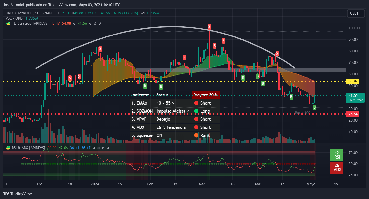 ORDI is going through an interesting pattern, even though it's a young coin. The short-term trend is bearish, with the EMA55 above of the EMA10. This is considered bearish because traders need to hold the coin for longer in order to be profitable. It also shows a strong ADX of 26 points.