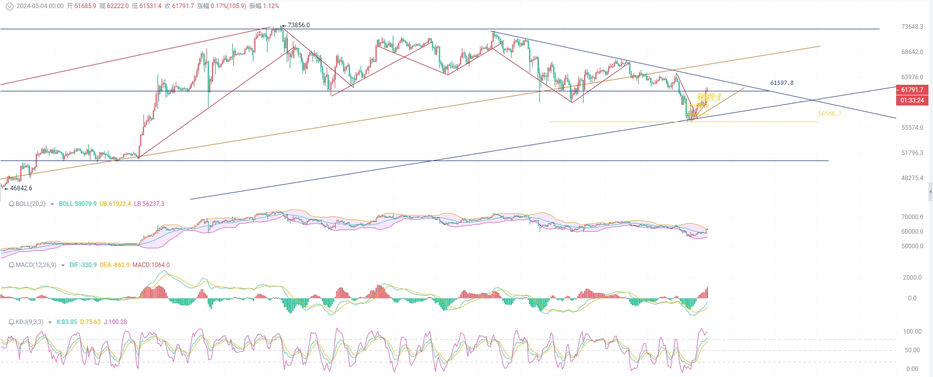 Looking at today's market, as of the time of writing, the current price of Bitcoin is around 61,800. The daily K-line and the predicted KDJ formed a golden cross after breaking through 61,500, and the EMA trend indicator turned the 60,800 resistance into support. The upper resistance has come to around 62,500. The MACD volume has started to increase, and the DIF and DEA, which were previously diverging, have started to converge. The overall trend of the Bollinger Bands is still bearish. The K-line stood at the lower support of 59,100 and stretched upwards. Pay attention to the 63,400 pressure level in the daily K-line Bollinger Bands. The trend gives a sense of unreality, but the strategy remains the same: just do what needs to be done at any position and don't be blinded by the false appearance of the market.