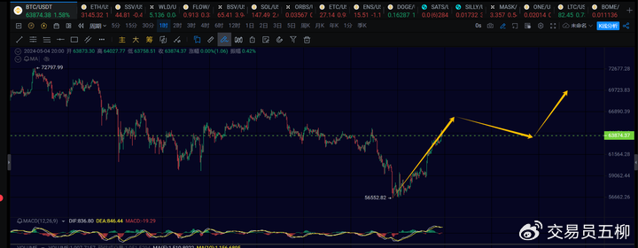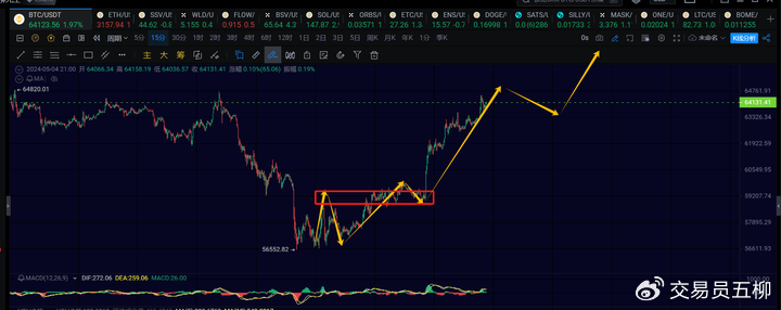 At the 15-minute level, it is currently running a 15-minute level rise after leaving the 15-minute level consolidation phase. It is expected that there will be a 15-minute level pullback in the evening or early morning, with attention to the range of 62500 to 63000, and then there should be another 15-minute level rise to around 67000. Or the big coin may oscillate repeatedly in the range of 63000 to 64500 for about a day, forming the second 15-minute level consolidation, and then continue to rise above 67000.