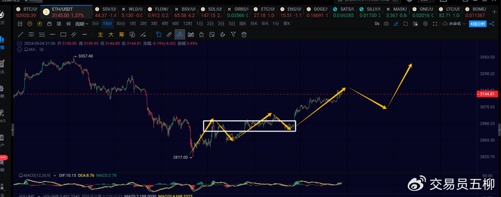 The current 1-hour level rebound of Ethereum should not have ended yet. There may be a 15-minute level pullback in the evening, as long as it does not fall below 3015, there is still expected to be a 15-minute level rise to continue to 3250. Originally, it was expected that Ethereum should go through another 1-hour level pullback to retest the low of 2800. If there is no retest in the future, then we will see if it breaks through 3357.