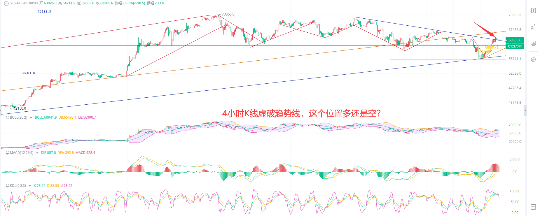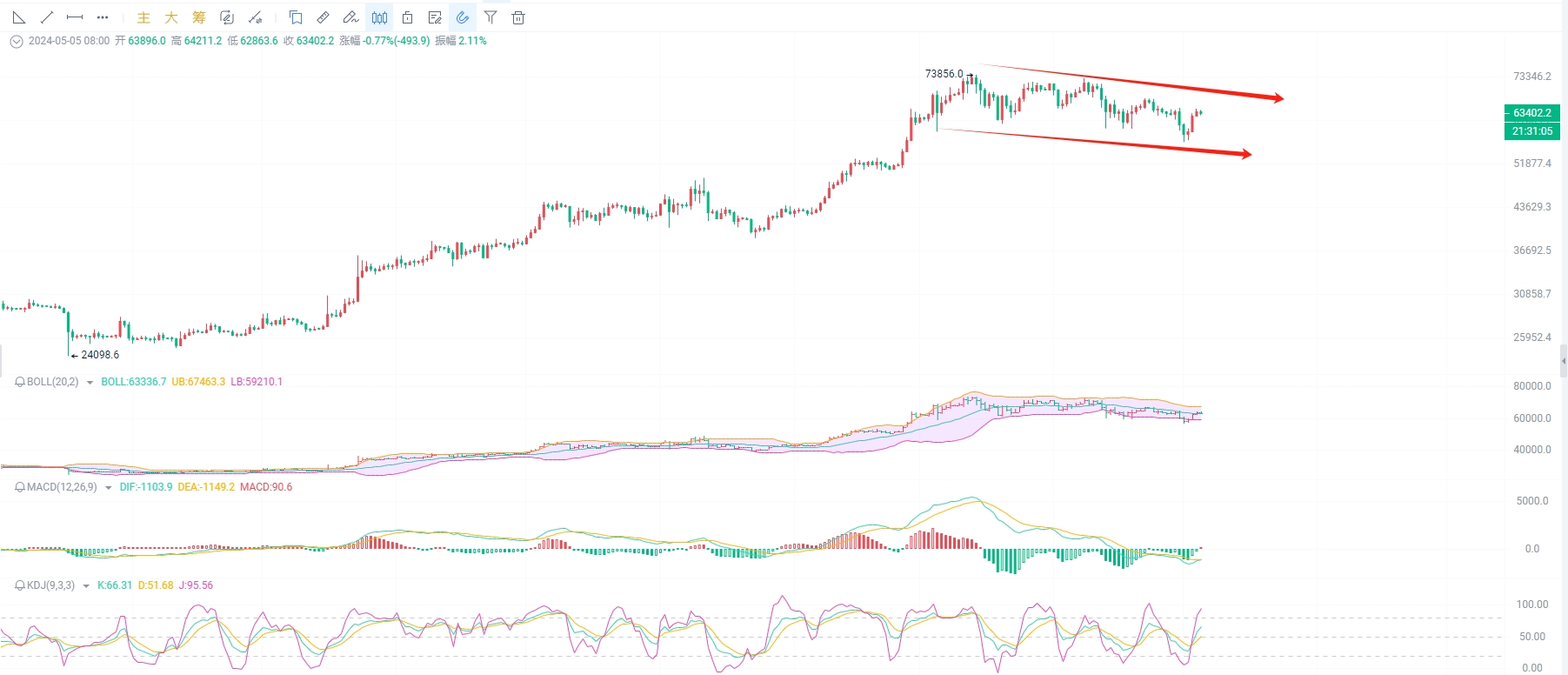 Let's review the actual situation from yesterday first. Based on the article updated after 2 am on May 4th, everyone should know about the short layout at 62,000, with a stop loss at 62,300. After being stopped out around 4 am, a long position was taken with a profit at 63,500. After reminding at around 9 am to take profit, I was able to relax and enjoy the May Day holiday. Several consecutive short-term actual battles won a 2300-point space.