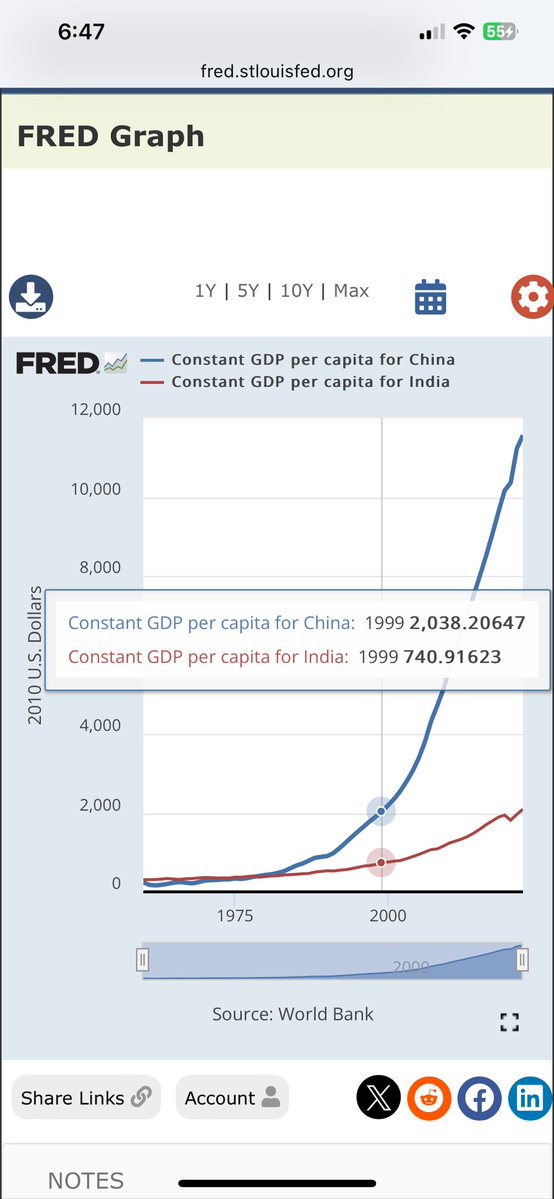 In terms of the unchanged GDP per capita, India is only at the level of China in the year 2000, lagging behind by a full 34 years.