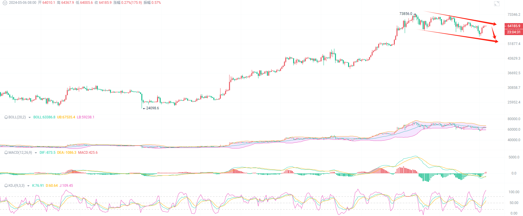 I believe many people followed the trend yesterday, after all, the train of thought given in yesterday's article was to short at 63900 with a target of 63000, then go long and take profit at 63900, with a combined profit of 1800 points. The only regret is the stop loss at 64600 for the third order, which led to exiting the position. Overall, the trend still leans towards short, but the upward space has not been fully exhausted, and there is a high probability of a short-term upward trend before coming down. Therefore, after the daily closing at 8 a.m., the Cryptocurrency Academician here has been positioning long at 64000, currently holding the position. Let's take a look at today's market.
