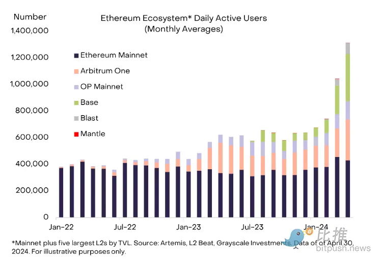However, what we should pay attention to is that on-chain activities in the Ethereum ecosystem have not been affected by this, but have instead shown a continuous growth trend. Especially in April, driven by Base and Arbitrum, the number of daily active users in the Ethereum ecosystem has climbed to 1.3 million (see Figure 5).