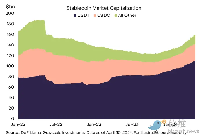In 2024, the stablecoin market has seen significant growth, with its total market value rapidly rising from $130 billion in January to $160 billion now, a 23% increase in just five months.