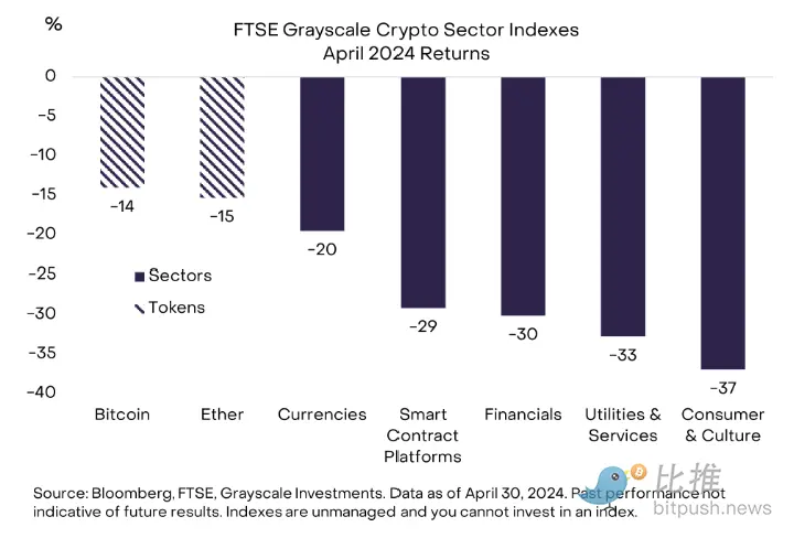 Both Bitcoin and Ethereum outperformed the FTSE Grayscale Cryptocurrency Industry Index in April. The index covers 243 tokens (or "altcoins") in five cryptocurrency sub-markets (Figure 7). The best-performing cryptocurrency sub-market in April was the currency sector (mainly due to the relatively stable price of Bitcoin), while the worst-performing was the consumer and culture sector. The weakness in this sector also reflects the downward adjustment trend after the strong rise of meme coins in March.