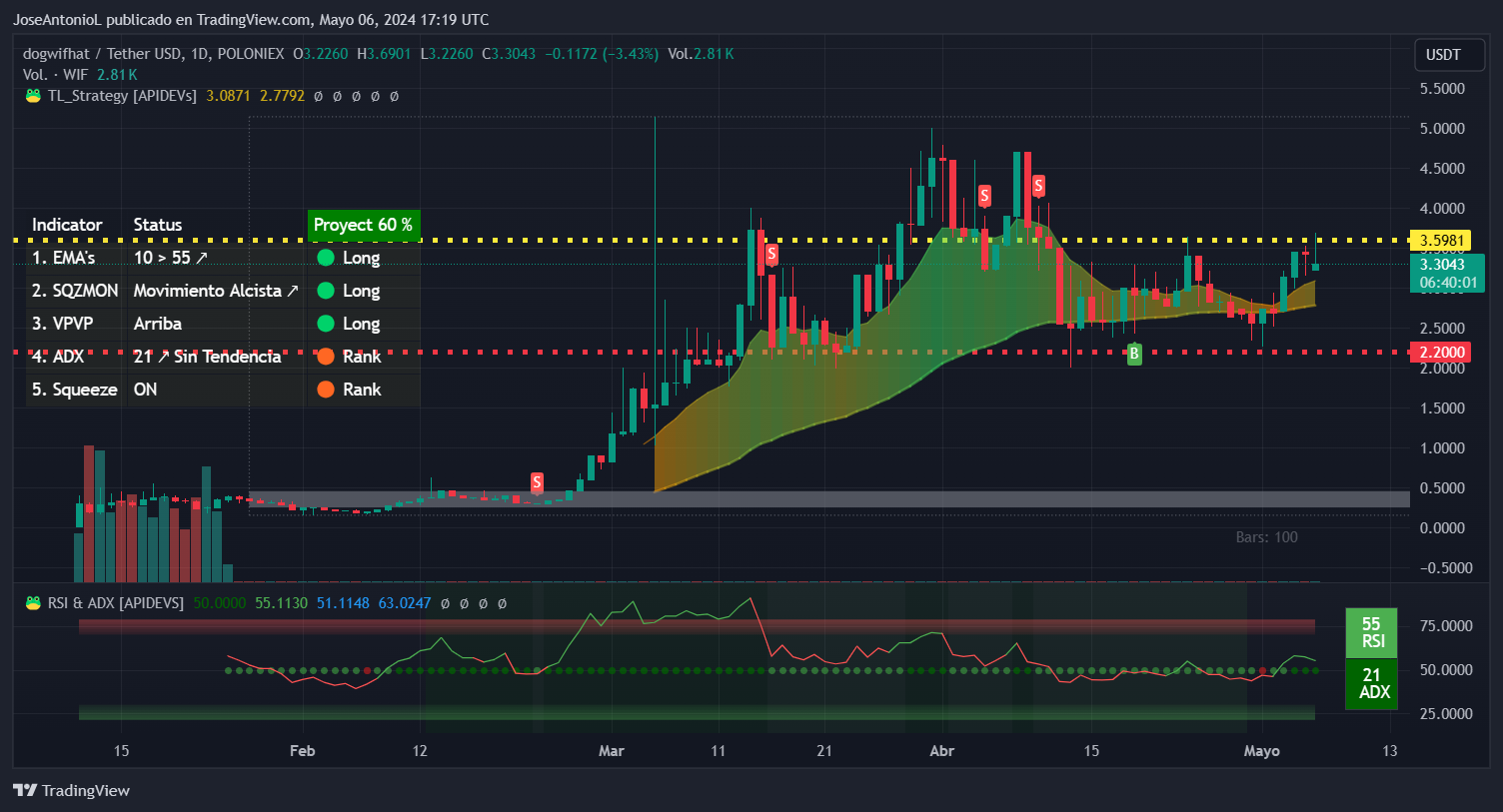 Overall, WIF seems to be trading sideways, testing its resistance once again as it looks to break into a stable bullish trend. The zone between $2.20 and $3.50 has kept the prices contained since March, with a short exception between March 28 and April 10. Given this balance of forces, the coin is suitable for day traders and swing traders to open and close positions with small gains, playing with those supports and resistances.