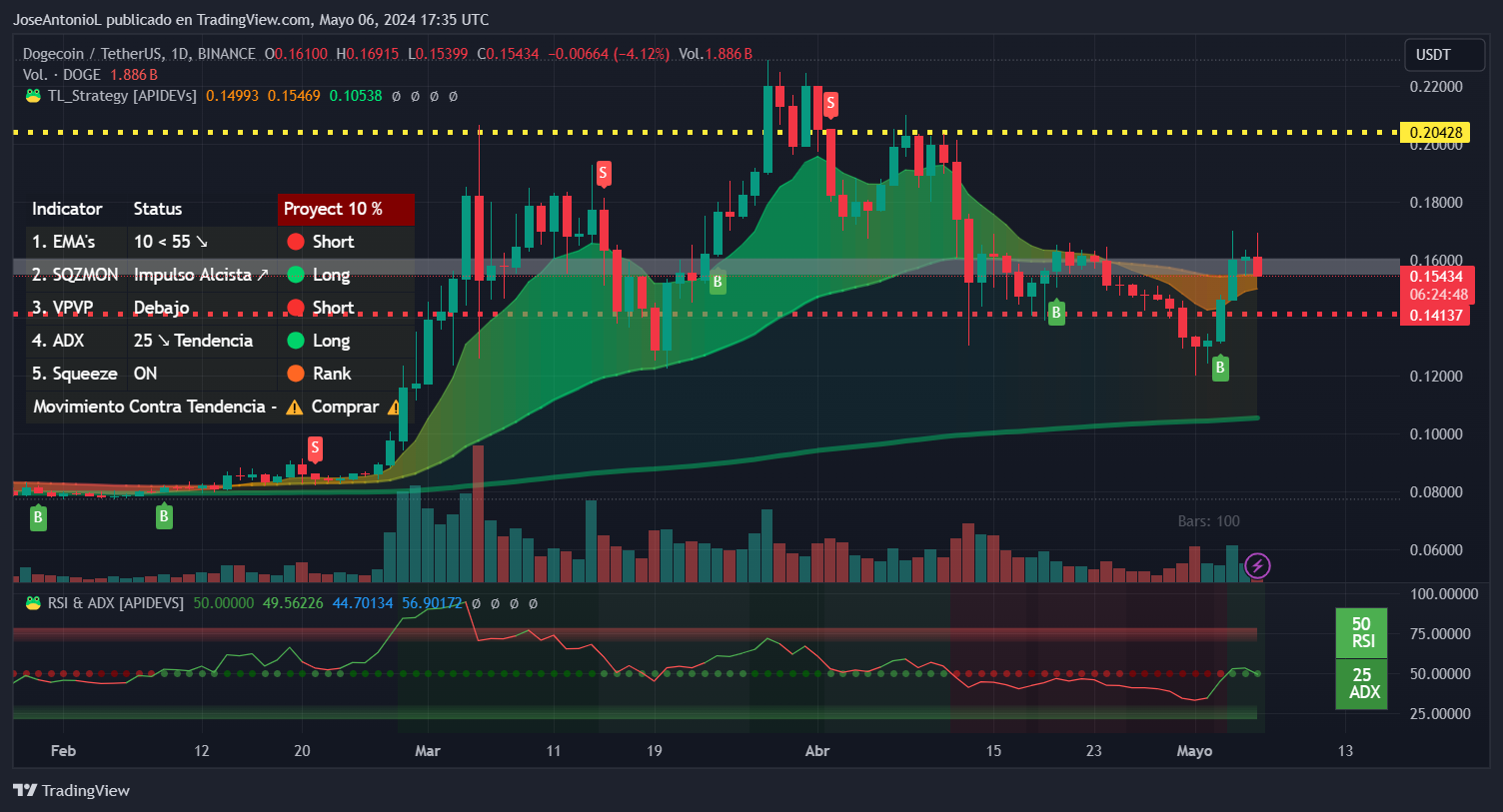 Dogecoin, the OG meme coin, is taking a similar course. The coin is recovering from a bearish correction that took its price down -45% in April. Right now, DOGE is trading at $0.1563, representing a -4.14% dip in the last 24 hours, with an overall weekly rebound of 10% in the last 7 days.