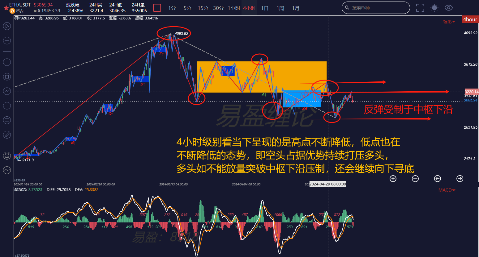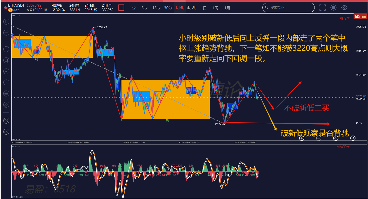 Looking at the 4-hour chart, the overall structure is as mentioned at the beginning of the article, with the bearish trend being the dominant force in the market during this period. The current 4-hour upward line segment, if it cannot break through the previous high point of 3357, will not be able to reverse the trend of continuously decreasing high points, and 2817 is probably not the bottom.