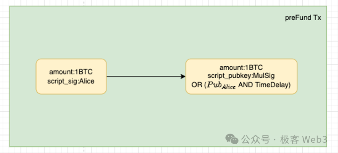 We will explain the operation of the OP-DLC bridge by going through the entire process of deposits and withdrawals. Let's assume that Alice is depositing 1 BTC to L2 through the OP-DLC bridge. According to the two-step transaction mechanism, Alice first generates a pre-fund transaction, as shown in the following diagram: