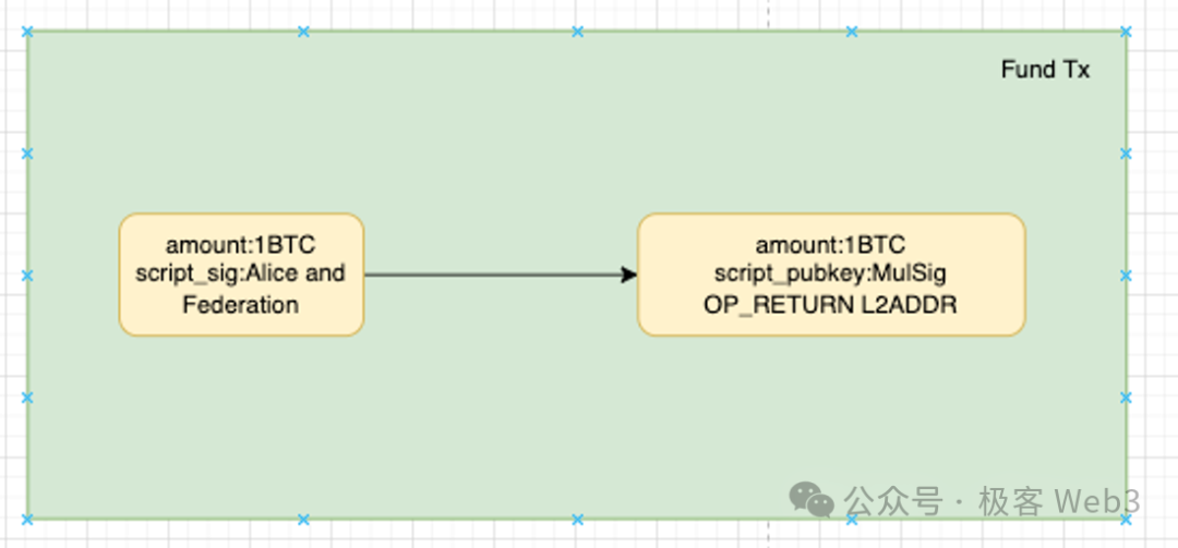 In the Witness/signature data of the Fund transaction, Alice will specify her receiving address on Layer2. After the Fund transaction is broadcasted to the chain, Alice can submit the above fund transaction data to the bridge contract on Layer2, proving that she has completed the deposit action on the Bitcoin chain and is eligible to have the tokens released to the specified receiving address by the L2 bridge contract.