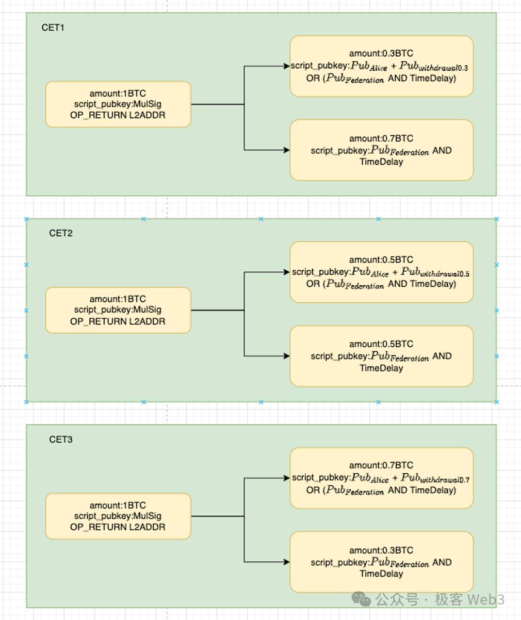 Next, let's analyze the CETs pre-constructed by Alice and the BitVM alliance. These CETs are used to meet potential withdrawal scenarios, such as Alice depositing 1 BTC but only withdrawing 0.3 BTC for the first time, with the remaining 0.7 BTC being allocated to the BitVM alliance's public fund pool. However, any further withdrawals can only be done through the BitVM bridge as mentioned earlier; or simply using the 0.7 BTC to initiate a new pre-fund deposit, as a new asset injected into the DLC bridge, repeating the previously mentioned fund transaction and CET construction process.