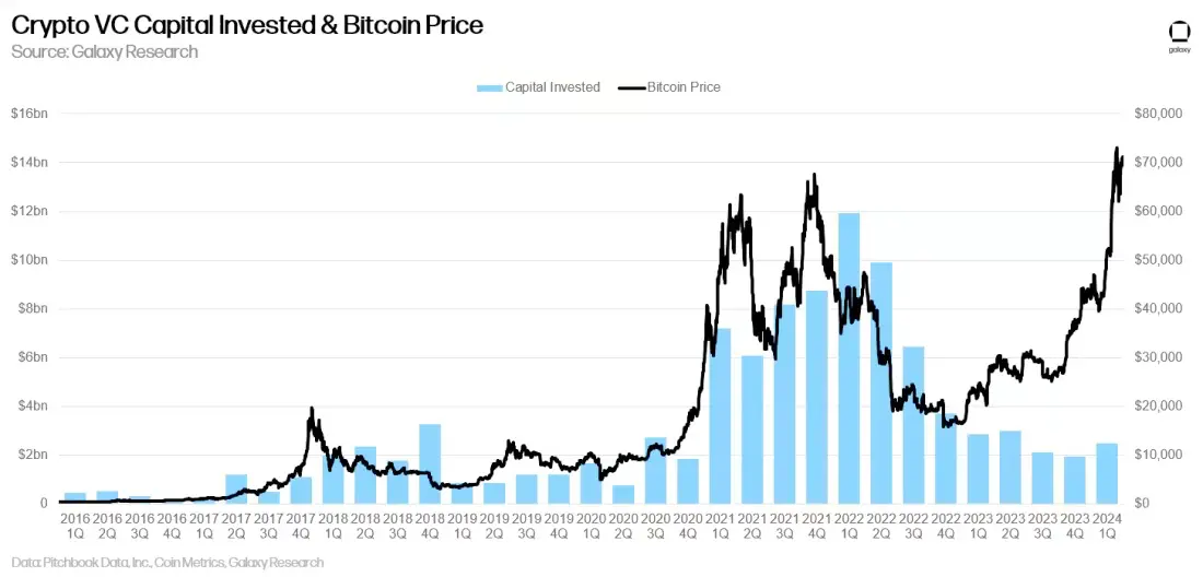 While venture capital in the cryptocurrency space is typically correlated with Bitcoin prices, this correlation has been broken over the past year, as Bitcoin has surged since January 2023, but venture capital activity has largely languished. In the first quarter of 2024, Bitcoin saw a significant increase, and although investment funds also rose, investment activity still fell far short of the levels seen the last time Bitcoin traded above $60,000. Native catalysts in the cryptocurrency industry (Bitcoin ETFs, re-staking, modularization, Bitcoin L2, and other new areas) and macro headwinds (interest rates) have contributed to significant divergences.