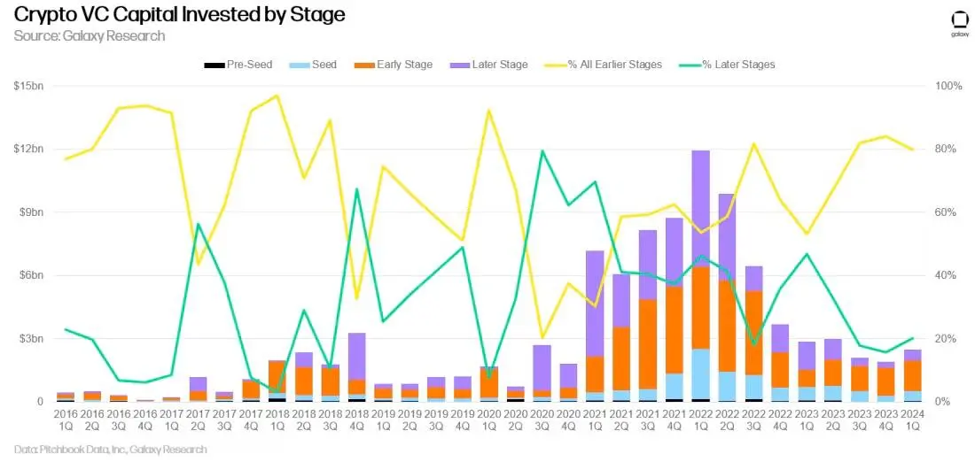 In the first quarter of 2024, about 80% of the funds flowed to early-stage companies, while 20% flowed to later-stage startups. Notable early-stage companies are still able to raise funds as cryptocurrency-focused early-stage risk funds remain active, and many funds relied on their fundraising in 2021 and 2022 to stay afloat. However, many large integrated venture capital firms have either exited the industry or significantly reduced their risk exposure, making it more difficult for later-stage startups to raise funds.