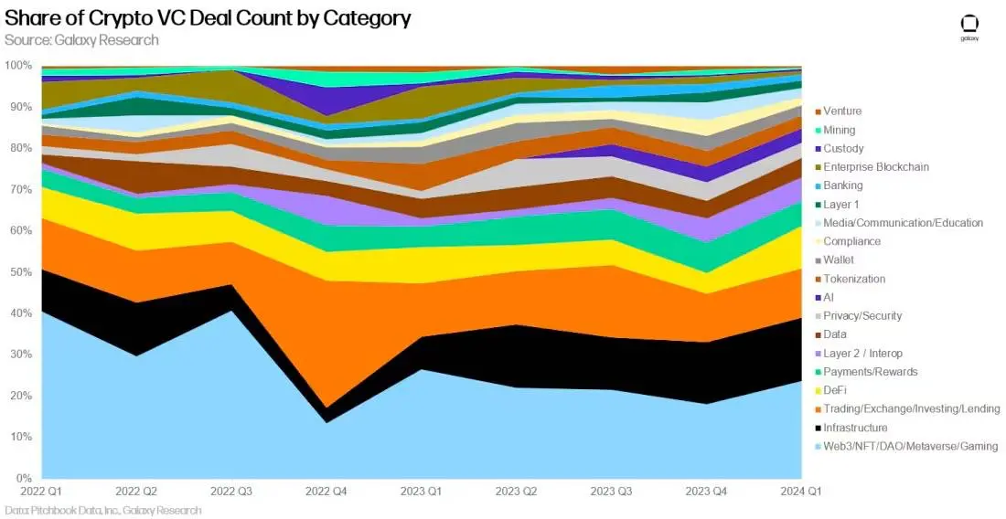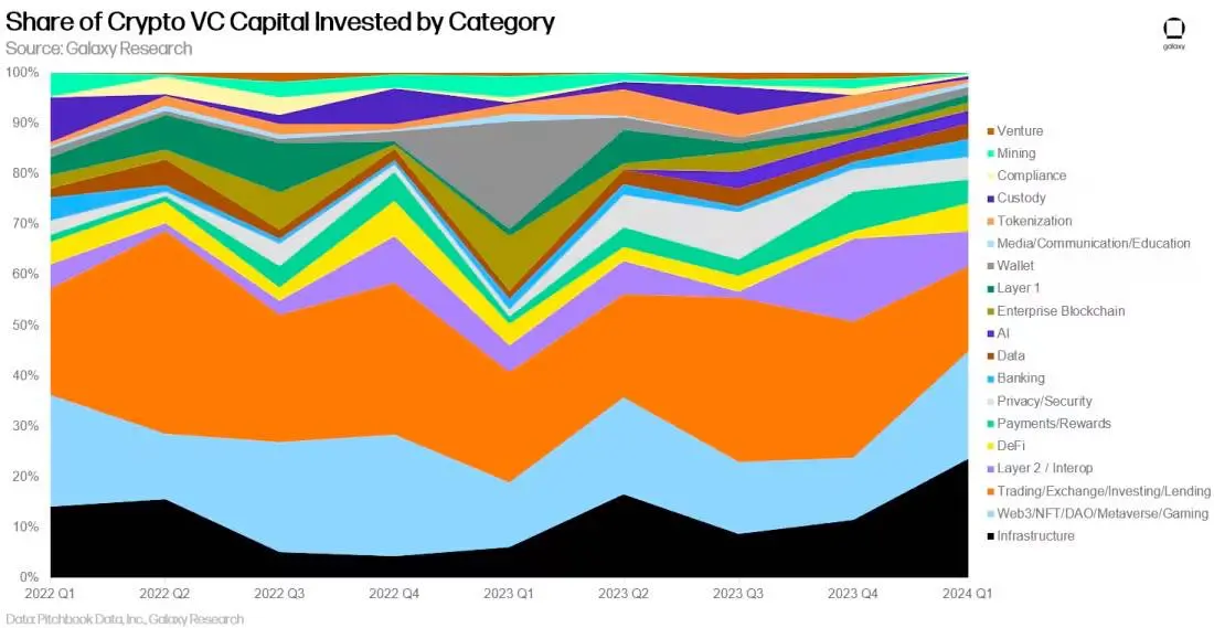 In the first quarter of 2024, the "Infrastructure" category received the largest share of cryptocurrency venture capital funding (24%), led by EigenLayer's $100 million financing.