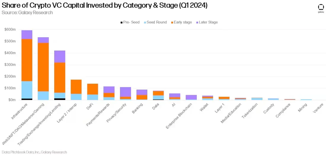 • Web3 and trading categories continue to dominate in terms of transaction volume and funds, but there has also been a significant increase in infrastructure transactions. Both in terms of funds raised and transactions completed, Web3 and trading categories still lead the way, but in the first quarter of 2024, "infrastructure" actually ranked first in terms of funds and second in terms of transactions. This category is indeed broad (all three categories are broad), but the infrastructure category broadly includes staking, restaking, platform tools, sequencing services, or other tools for blockchain developers and users. EigenLayer's $1 billion funding round led infrastructure funding.