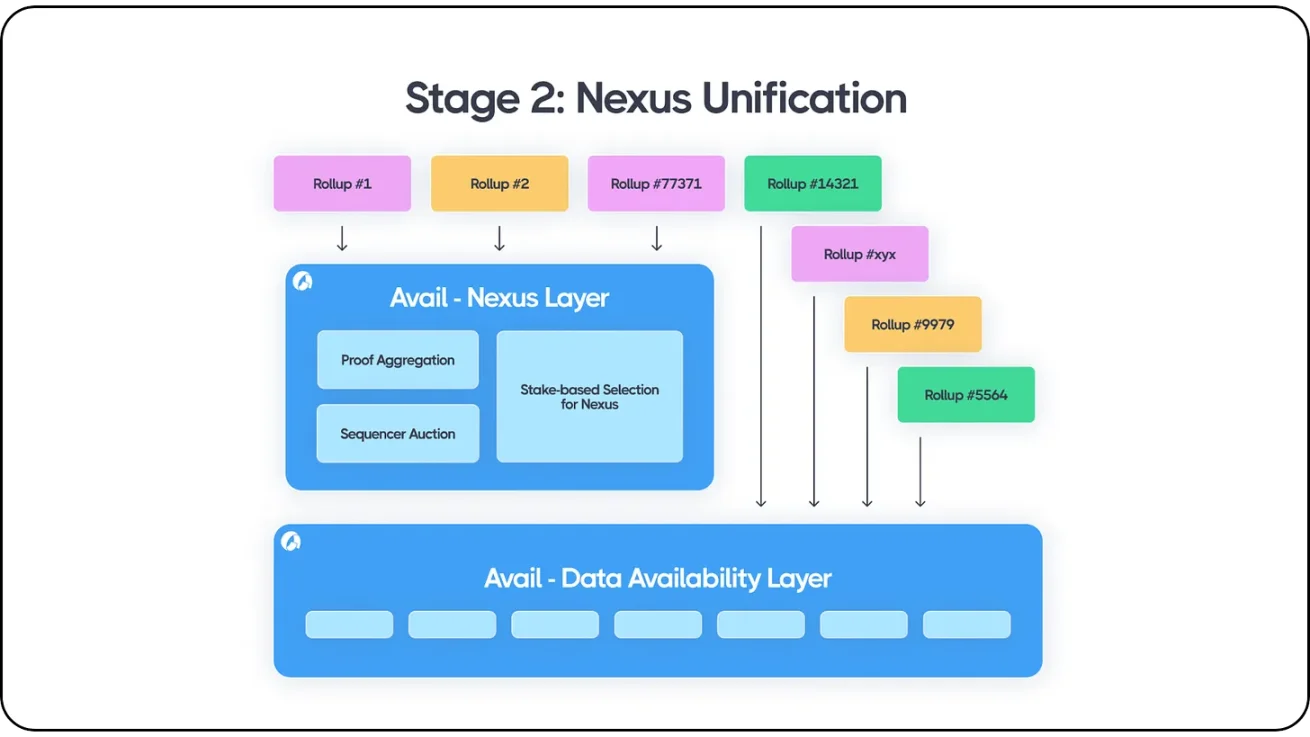 The model works similarly to Avail's Nexus interoperability layer, which includes proof aggregation and sorting auction mechanisms, making their DA product more robust. Like Polygon's AggLayer, each chain or Rollup integrated with Avail can interoperate within Avail's existing ecosystem. Additionally, Avail pools ordered transaction data from various blockchain platforms and Rollups, including Ethereum, all Ethereum Rollups, Cosmos chains, Avail Rollup, Celestia Rollup, and different hybrid structures such as Validiums, Optimiums, and Polkadot parachains. Developers from any ecosystem can build on Avail's DA layer without permission, using Avail Nexus for proof aggregation and messaging across ecosystems.