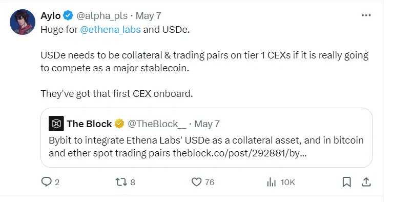 After community members preemptively announced this news, the ENA/BTC trading pair saw a good increase on Monday this week. Subsequently, Ethena Labs officially announced on Twitter on Tuesday this week that USDe will be integrated into the Bybit exchange, which is the fourth largest futures trading volume exchange in April. In the afternoon of the same day, ENA soared to $1, reaching a new high since May.
