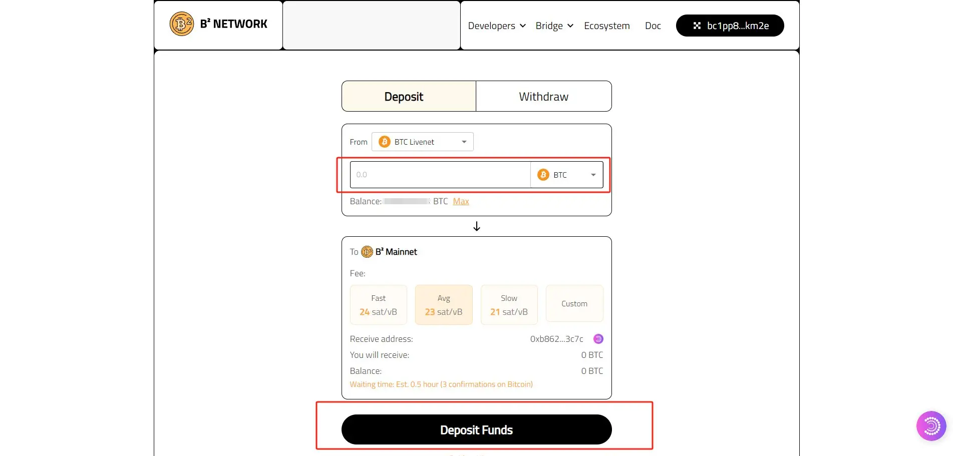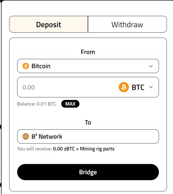 Before starting, we need to bridge BTC assets to the B ² mainnet. After entering the website, connect to the OKX or Unisat wallet, enter the amount of BTC to be bridged, and click "Deposit Funds".