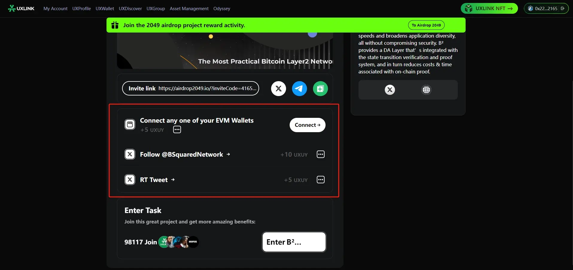② UXLink event: In order to seamlessly onboard more web2 users to web3, B² Network and UXLink have launched this event. After entering the website, follow the instructions to connect your wallet, follow and retweet to complete the task, then click on "UXLINK NFT" in the upper right corner to mint NFTs, and receive triple airdrop rewards from UXLink, B² Network, and LayerCraft!