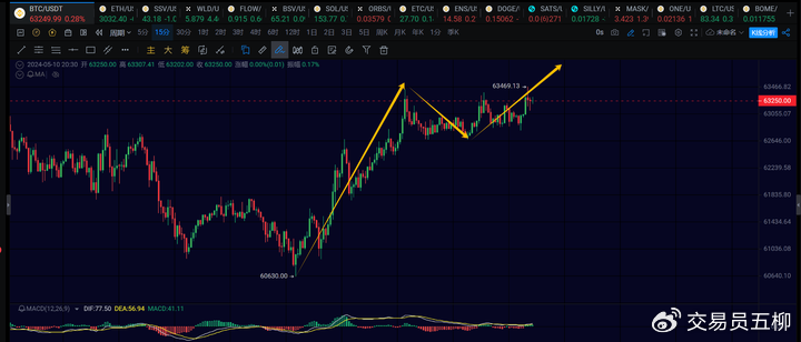 After the pullback of Bitcoin to 60630, as expected, a rebound at the 1-hour level has occurred. From the current rebound strength, it is relatively weak, reaching our expected level of around 63500. If it cannot break through 64422 again, it is expected to undergo another 1-hour level pullback to around 60000, consolidate a 1-hour level range, and then continue to rise.
