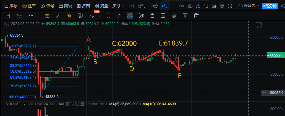 BTC: From the perspective of the four-hour chart pattern, the current correction is likely to have ended. The candlestick closing at 12 o'clock last night also confirmed the new upward trend. The 55969 level of BTC is likely to be the low point of this correction, which is also the 50% position of the golden ratio. Currently, both the hourly and four-hour charts of BTC are above the support line, and reaching a new high is only a matter of time.