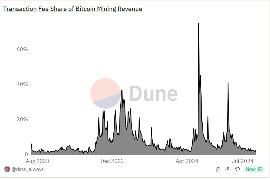 Source: Dune analytics (@data_always), proportion of transaction fees to mining rewards, as of July 22, 2024.