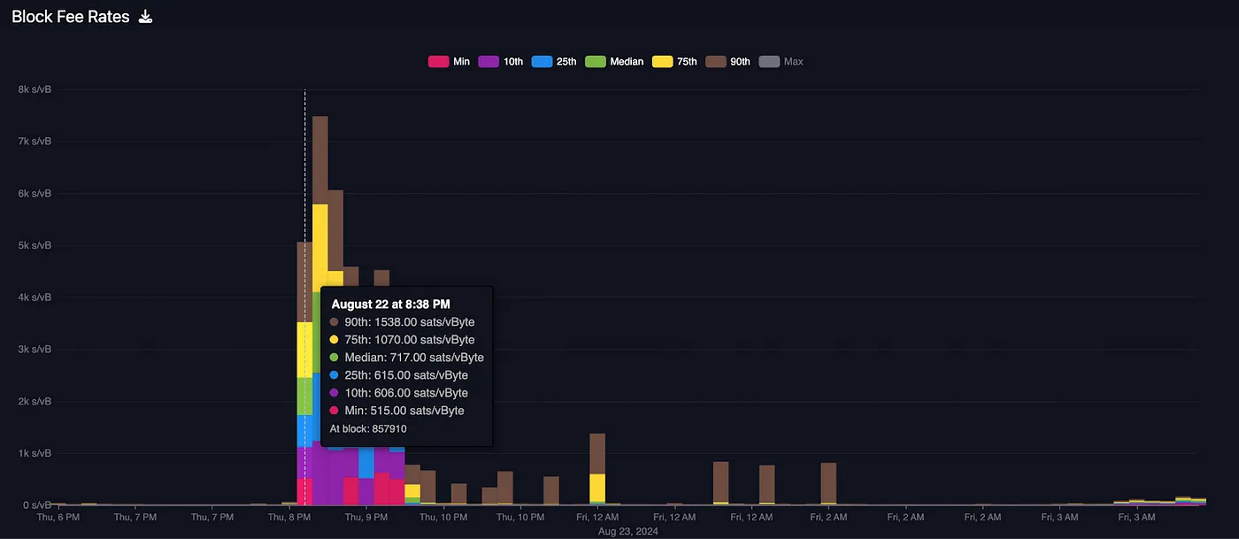 At the launch of the Babylon mainnet, the fee rate rose to 1,000 sats/vBytes, source: Mempool.space