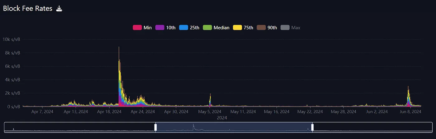 The following graph shows the increase in fees relative to block rewards during the launch of the highly anticipated Ordinals and Runes, which at one point accounted for over 60% of Bitcoin mining revenue.