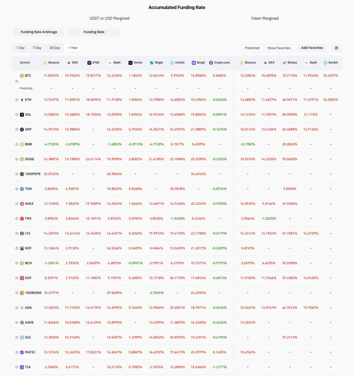Figure 4: Cumulative funding rates for most tokens are positive over one year, Source: Coinglass
