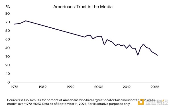 The Grayscale Research team has previously written about how the 2024 U.S. election has become a "crypto election," with crypto increasingly becoming a relevant issue in the campaign. The attention to crypto applications, especially against the backdrop of declining media trust and increasing polarization, highlights the potential role of Polymarket—more broadly, the role of blockchain technology—in providing a reliable, transparent alternative in the noise to seek the truth.