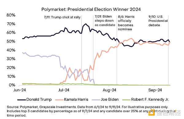 This year's U.S. presidential election has fueled interest in Polymarket, driven by highly unpredictable scenarios such as Trump being assassinated or Biden dropping out and supporting Harris (Figure 3). As shown below, the market for the winner of the U.S. presidential election on the platform reflects political odds fluctuations based on these events. This specific market has absorbed the largest liquidity on the platform, with a trading volume of $776 million as of September 4th.[10]