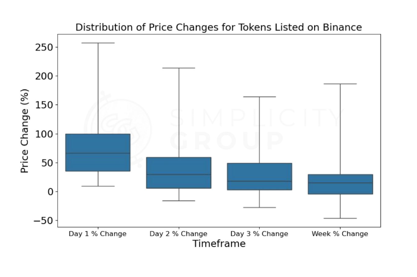 Most tokens experience significant price increases within 24 hours of listing, usually followed by a pullback starting on the second day.