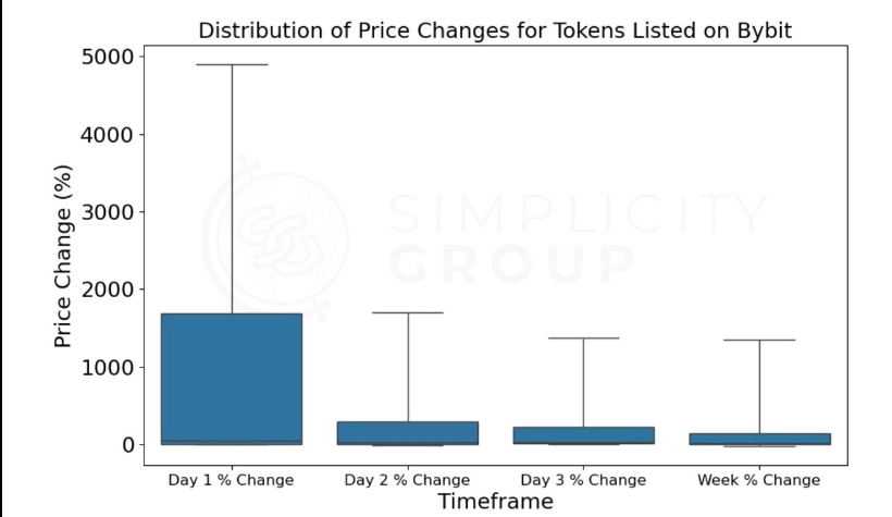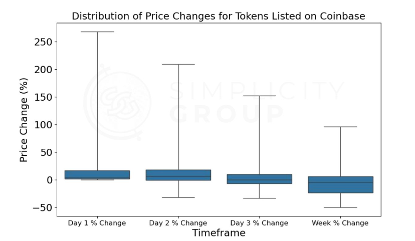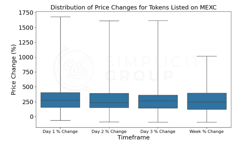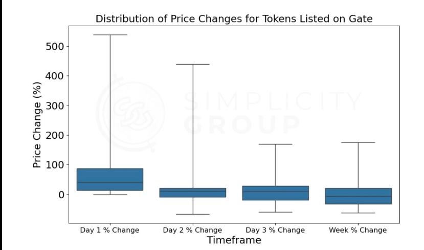 The most drastic price changes occurred on the first day, with the majority of tokens (the middle 50%) seeing increases between 4.6% and 1685.7%;